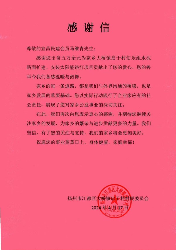 近日,民建点军基层委员会二支部会员马维青收到一封来自其家乡的感谢信,信中对他为家乡建设捐款五万余元的善举表示感谢,赞扬了其无私奉献的精神,仁爱善良的品质。
