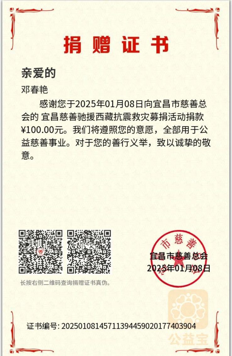 邓春艳表示:“西藏日喀则市定日县地震灾情,引起了社会各界的极大关切。在大灾大难面前,作为一名民建会员,希望通过奉献一份爱心,让灾区人民感受到我们都在一起。”(作者:邓春艳、高甜甜 初审:刘争 二审:章德胜 终审:徐姗)