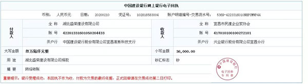 继1月26日向民建企业家协会捐款1000元,1月31日再次向宜昌市慈善总会捐款20万元后,2月8日,会员企业湖北盛荣建设有限公司董事长徐凤阳向公司全体员工发出倡议,让大家力所能及为打赢这场战“疫”献出绵薄之力,不到一天时间,筹得善款3.6万元,并通过民建企业家协会账户捐给宜昌市慈善总会。