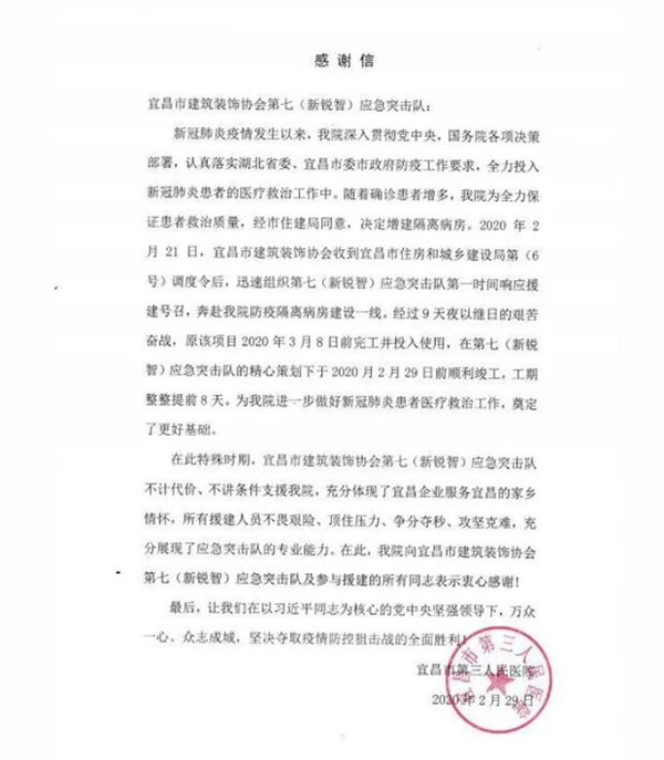 3月1日上午,宜昌市三医院旧病区改造施工项目顺利完成。原计划3月8日完工的项目,民建人用实际行动抗击疫情,为抗击疫情赢得了时间,为生命保障奉献了民建人的力量,受到院方的一致好评,工程结束后,第三人民医院特地为应急突击队(新锐智)送来了感谢信。