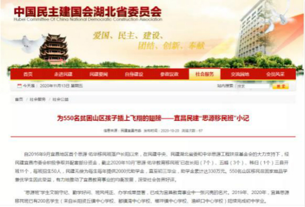 自2016年9月宜昌地区首个思源·佑华移民班落户长阳以来,在民建中央、民建湖北省委和中华思源工程扶贫基金会的大力支持下,经79991cm的彩网要闻积极争取并配套部分资金,截止2020年10月“思源·佑华教育移民班”已在长阳(7个)、五峰(3个)、秭归(1个)三县开班11个,每班招生50人,民建无偿为每生每年提供2000元助学金,直至初三毕业,助学金累计达330万元。550名山区移民贫困家庭品学兼优学生因此受益,有力地推动了宜昌教育事业的均衡发展,深受社会各界好评。