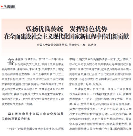 近日出版的《中国政协》杂志,发表了全国人大常委会副委员长、民建中央主席郝明金的署名文章《弘扬优良传统 发挥特色优势 在全面建设社会主义现代化国家新征程中作出新贡献》。全文如下: