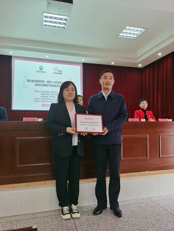 ▲芭莎慈善基金主任陈怡(左一)为长阳县教育局颁发项目合作县牌匾