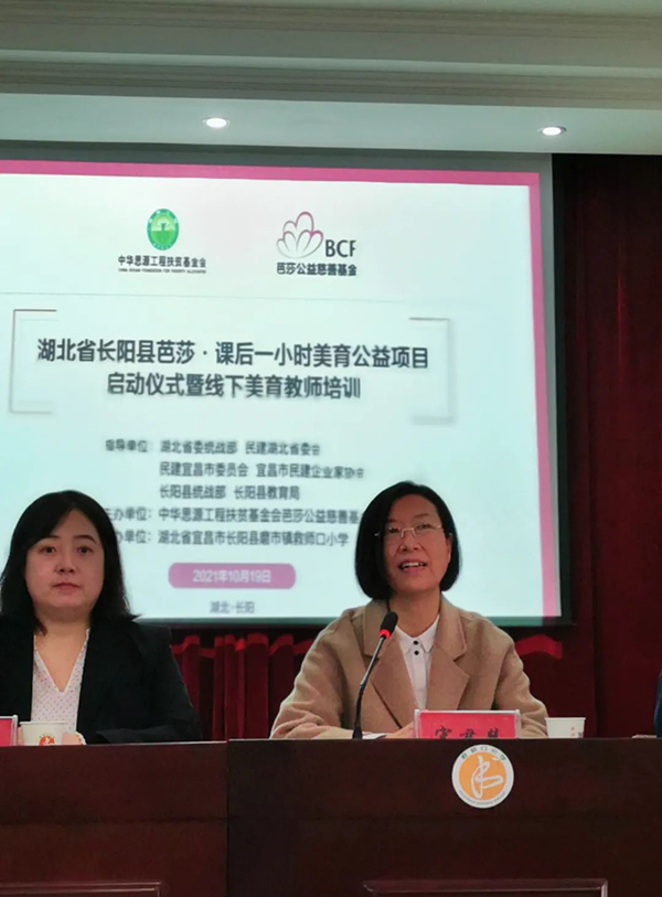 中华思源工程扶贫基金会芭莎公益慈善基金主任陈怡对项目的背景、进展情况及下一步实施计划进行了解读,并为长阳县教育局颁发项目合作县牌匾。各受益学校校长就项目实施中可能面临的困难和建议进行了交流与探讨。随后,分校长、美育教师分别进行校长沟通会、美育教师专题培训。