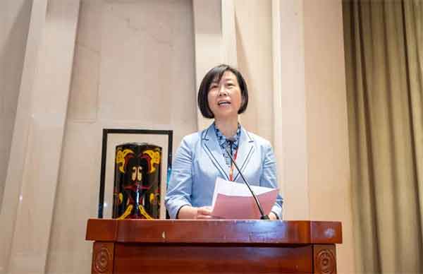 ▲民建省委专职副主委宋君慧宣读《民建湖北省第九次代表大会给离任同志的致敬信》
