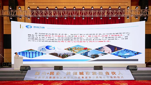 在民建湖北省委副主委、宜昌市人民政府副市长、民建宜昌市委主委张琼,宜昌城发集团党委书记、董事长殷俊,民建宜昌市委专职副主委徐姗,宜昌城发集团党委成员、纪委书记刘仁,民建宜昌市委副主委李立军,宜昌城发集团党委成员、副总、总经济师胡智勇,民建宜昌市委副主委姜媛的共同见证下,宜昌城发集团党委副书记、总经理徐强,民建宜昌市委副主委、民建企业家协会会长、湖北和远气体股份有限公司董事长、总经理杨涛分别代表双方签约。