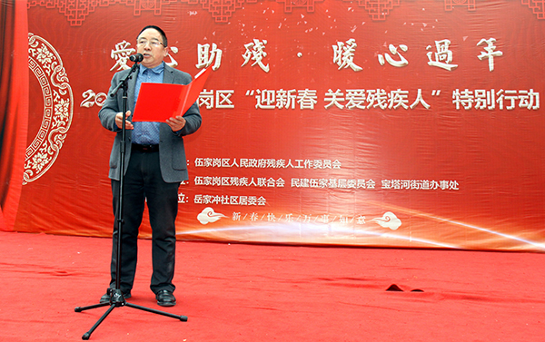 1月17日,一场由社区居民、残疾人自编自演的文艺演出,拉开了 2020年伍家岗区“迎新春 关爱残疾人”特别行动集中走访慰问活动。民建伍家岗基层委员会主委张永强代表捐赠方上台讲话,并向残疾人赠送慰问金和爱心物质。