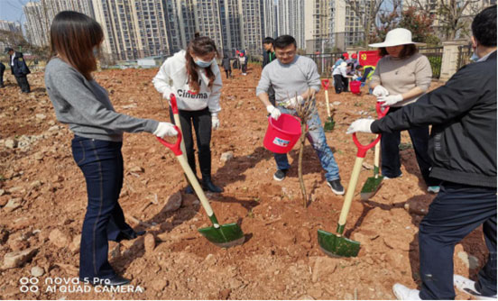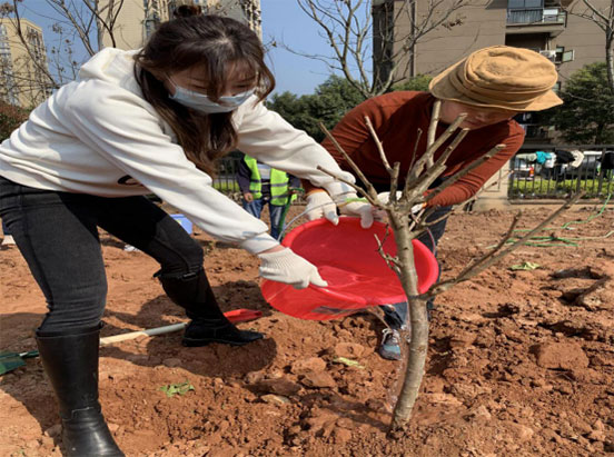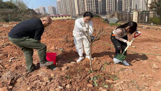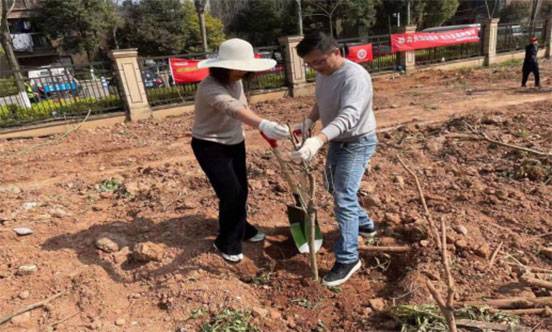 这是湖北中新科维检验检测有限公司覃光军、刘凤芹,他们是一对恩爱夫妻,都是民建会员。在植树过程中你一言我一语,默契地配合、相互协作,希望这颗树能见证他们幸福的爱情。