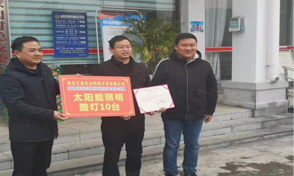 12月18日,暖阳高照,民建三峡大学基层委员会的会员们带着满满的爱心,一起前往肖家岗村。在充分考虑环境因素的前提下,宜昌汇森生态有限公司向肖家岗村捐赠10台太阳能路灯,在帮助当地村民解决夜间照明问题的同时,又能做到零排放零污染,保护美丽乡村的生态环境。