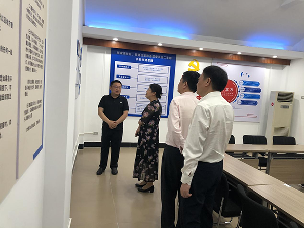 在民建伍家岗基层委员会二支部统战实践基地,支部主委向劲松向调研组一行介绍了支部发挥民主党派优势,与万寿桥街办张家店社区共同打造统战阵地,全面参与阵地共建、协商民主、考察调研以及社会服务等工作。