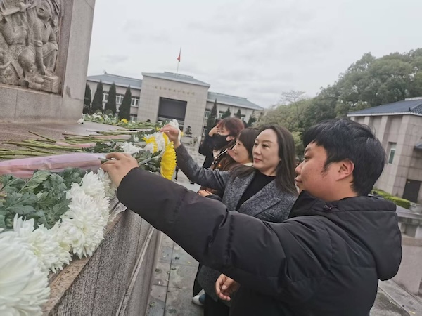 会员们在烈士纪念碑前默哀致敬,敬献鲜花,深切缅怀革命先烈。