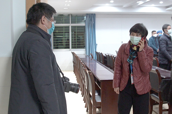 休会间隙张琼给正在三医院拍摄《宜昌战“疫“》纪录片的民建会员覃啸洪打气鼓劲