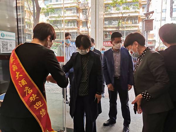 踩过消毒垫、扫码、免接触消毒洗手、测温.....在经过一系列严格的安全检测措施后,周正英副市长一行进入到位于胜利三路的聚翁酒店大堂内。聚翁餐饮管理公司董事长黄大菊向周正英副市长详细介绍了公司在疫情防控过程中所采取的各项安全举措,并重点向周副市长汇报了企业当前的复工复产情况和在疫情期间调整战略、重新布局的思路与尝试。