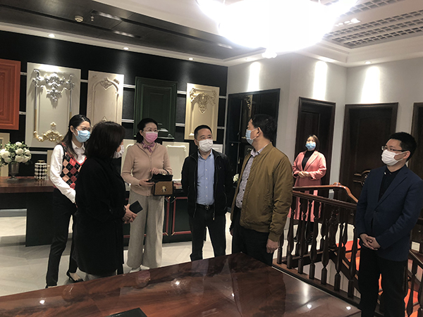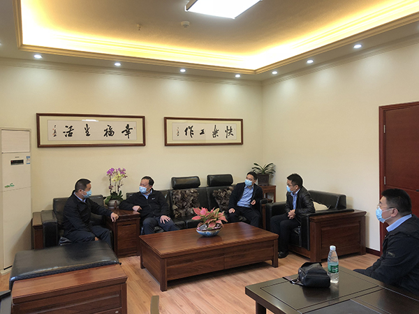 4月8日,高后远董事长向前来调研的市政协主席宋文豹(右二)汇报企业疫情防控及复工情况。市委会副主委孟美蓉陪同。