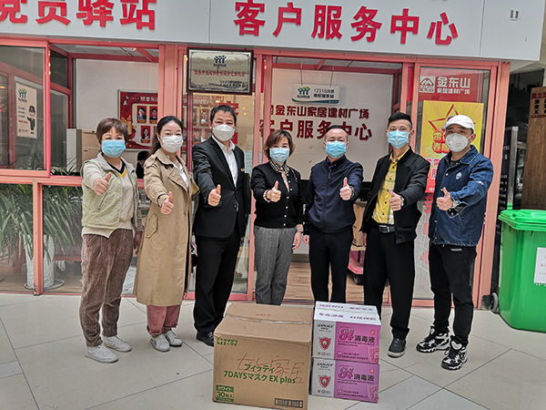 2020年1月24日新冠肺炎疫情暴发,金东山家居建材广场董事长高后远根据权威媒体多次报道的病毒潜伏期的种种迹象判断,此次疫情非同寻常。他第一时间组织公司管理团队召开抗疫专题会议,启动应急模式,成立抗疫专班,部署防控工作,要求大家树立高度的警觉,做好充分的迎战准备。市场在确保安全前提下,精简配置场内值班人员,一手抓防疫,一手抓消防,安全两不误。此时正值市场春节放假时期,大部分从业者已经回家休假,为了迅速掌握大家的安全状况,抗疫专班立马开展网上信息对接,要求所有员工每日在微信群内报告自己和家人的安全情况,市场及时了解疫情最新动态,要求大家按照科学方法做好自我防护。数千名从业者通过网络保持信息互通,形成统一战线。
