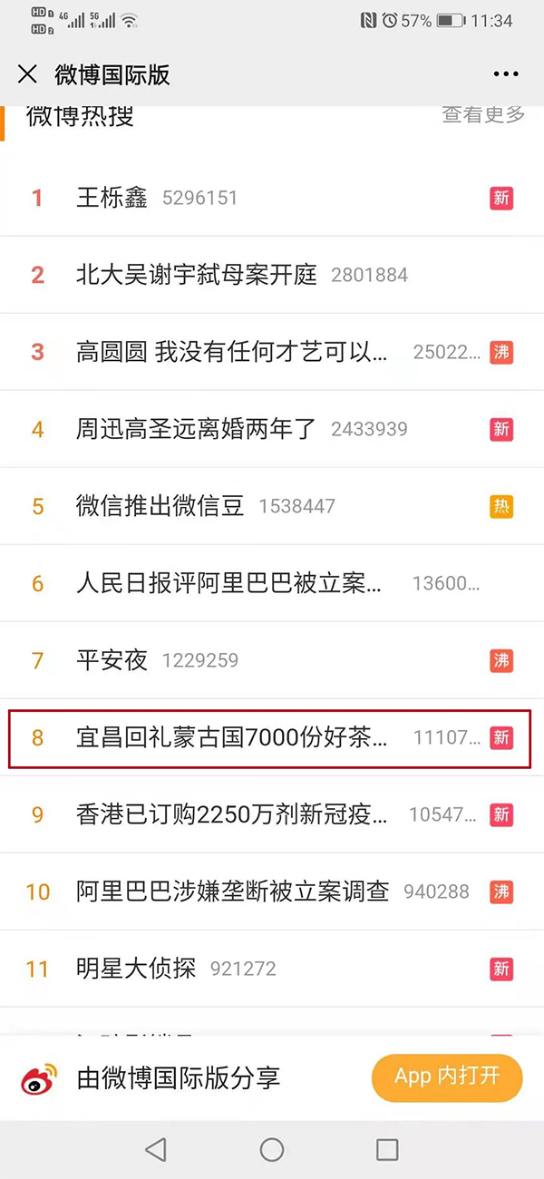 在社交媒体上,网友纷纷为鑫鼎集团点赞,#宜昌回礼蒙古国7000份好茶启运#冲上了热搜榜,目前话题阅读量已达到1000多万。