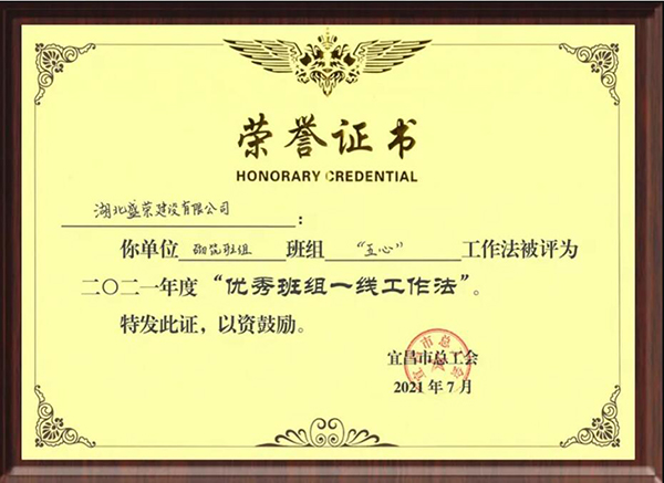7月9日,民建会员企业湖北盛荣建设有限公司“五心工作法”由宜昌市住房和城乡建设工会指导并推荐,在市总工会举办的“优秀班组一线工作法征集展示活动”中,经过材料初审、现场PPT演讲展示和专家评分等环节,从全市各行业40个一线班组工作法中脱颖而出,以综合评分第8名的优异成绩荣获“宜昌市优秀班组一线工作法”称号。