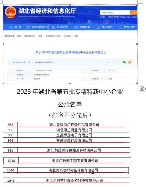 近日,湖北省经济和信息化厅公示了《关于2023年湖北省第五批专精特新中小企业名单》,宜昌民建六家会员企业经过层层严格评审,荣获湖北省“专精特新”中小企业称号。它们分别是:湖北晋远酒店设备用品有限公司、宜昌宏晨包装有限公司、湖北灏瑞达环保能源科技有限公司、湖北佳玛驰生态农业有限公司、湖北美力防护设施科技有限公司、湖北龙狮节能环保特种电缆有限公司。