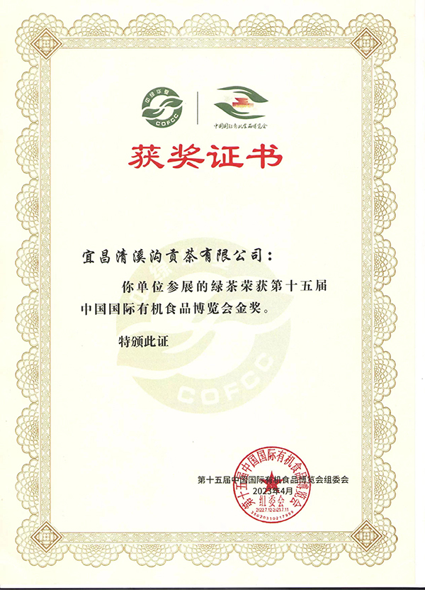 4月2日,由中华人民共和国农业农村部批准,中国绿色食品发展中心、中国绿色食品协会、安徽省农业农村厅以及合肥市人民政府联合主办,安徽省绿色食品管理办公室、合肥市农业农村局以及厦门市凤凰创意会展服务有限公司联合承办的“第二十二届中国绿色食品博览会、第十五届中国国际有机食品博览会大赛”中,宜昌会员企业宜昌清溪沟贡茶有限公司参赛的有机绿茶以其珍贵的鲜叶原料、古法贡茶的制作工艺、细秀匀直的成品外形、香如兰桂的原生态芬芳以及独成韵致的朵朵茶芽和澄澈茶汤再次蝉联第十五届“中国国际有机食品博览会金奖”。