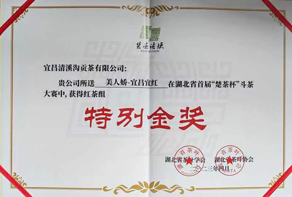 4月21日,在由湖北省茶叶学会、省茶叶协会主办,省农业科学院果树茶叶研究所承办的湖北省首届“楚茶杯”斗茶大赛中,宜昌会员企业清溪沟贡茶有限公司选送的美人娇•宜昌宜红以其色泽乌油润显金毫、花果蜜香,滋味醇厚甘爽,汤色鲜艳红明亮等优异的品质,受到广大与会人员的高度评价,斩获(红茶组)特别金奖。