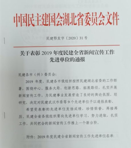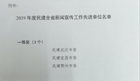 近日,民建湖北省委对外发出通报,对2019年度全省新闻宣传工作先进单位进行了表彰,宜昌民建获得一等奖。