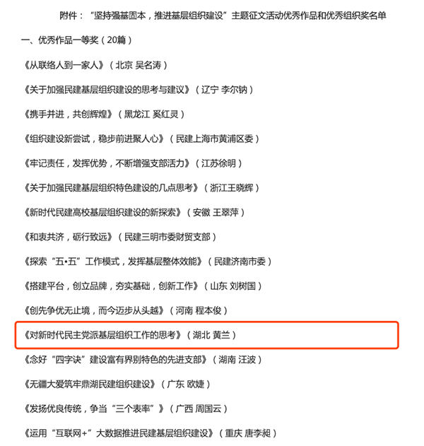 此外,在民建中央开展的“坚持强基固本,推进基层组织建设”主题征文活动中,宜昌民建获评全国一等奖一篇,全国二等奖一篇。高新区一支部黄兰同志撰写的《对新时代民主党派基层组织工作的思考》获得全国一等奖。