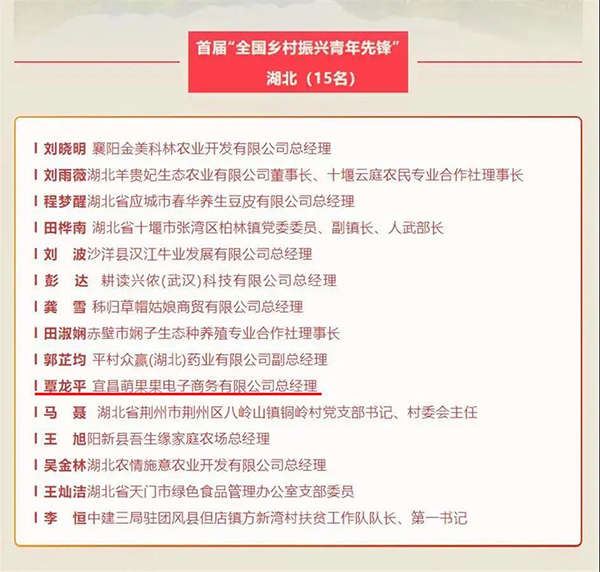 近日,共青团中央、农业农村部联合发布了《关于表彰首届“全国乡村振兴青年先锋”的决定》,授予10名同志首届“全国乡村振兴青年先锋”标兵称号,授予380名同志首届“全国乡村振兴青年先锋”称号,湖北共有15人上榜,其中包括宜昌民建企业家协会会员、宜昌萌果果电子商务有限公司总经理覃龙平。湖北入选的15名青年先锋,涵盖涉农创业、乡村治理、科技兴农、乡村社会实践等领域,他们都是在各自平凡的岗位上做出了不平凡的业绩,用实际行动生动诠释了新时代青年投身乡村振兴的责任担当。据悉,“全国乡村振兴青年先锋”是共青团中央、农业农村部授予在乡村振兴战略实施中作出积极贡献的青年人才的全国性奖项。该评选活动是经中央批准,由原“全国农村青年致富带头人”评选活动变更而来,每两年开展一届,旨在表彰先进、树立榜样,在全社会营造到乡村一线去建功立业的浓厚氛围,鼓励引导更多青年投身乡村振兴战略伟大实践。