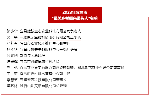 为树立先进典型,凝聚强大精神动力,培育和践行社会主义核心价值观,继承和发扬“上下同心、尽锐出战、精准务实、开拓创新、攻坚克难、不负人民”脱贫攻坚精神,进一步动员社会各界力量积极参与巩固拓展脱贫攻坚成果、全面推进乡村振兴。由宜昌市委宣传部、市文明办、市乡村振兴局联合组织开展的2023年宜昌市“最美乡村振兴带头人”选树活动,结果于近日揭晓,宜昌市民建企业家协会副会长、湖北一致魔芋生物科技股份有限公司董事长吴平等10人当选“最美乡村振兴带头人”。