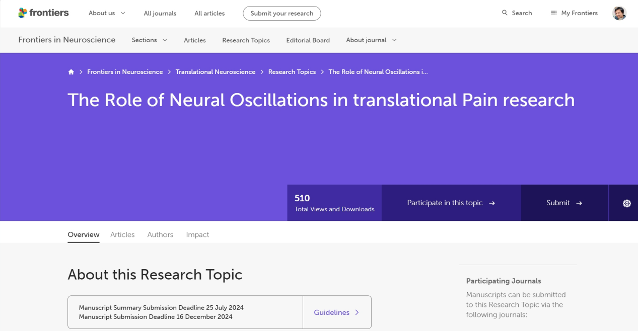 | 近日,民建伍家岗基层委员会二支部会员、宜昌市中医医院康复医学中心主任向安峰受邀主持的专刊《The Role of Neural Oscillations in Translational Pain Research》正式在神经科学前沿杂志《Frontiers in Neuroscience》官网上线。本专刊旨在吸引国内外的学者从神经振荡的角度就疼痛诊疗的新思路和新策略发表见解。