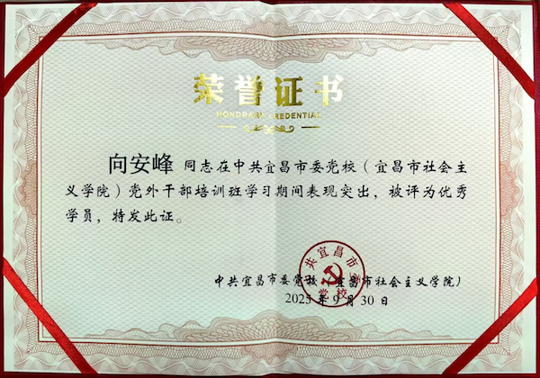 9月30日,中共宜昌市委党校举行2025年党外干部能力提升培训班结业典礼。参训学员、民建伍家岗基层委员会二支部委员向安峰在培训期间表现突出,荣获“优秀学员”称号。