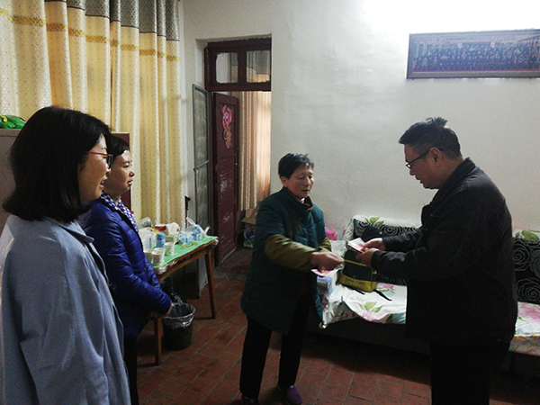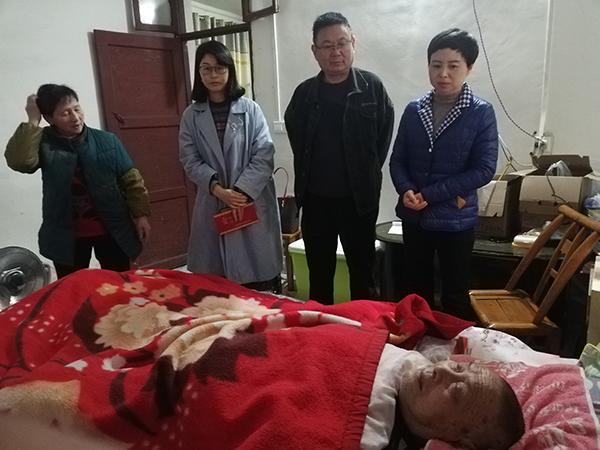 3月26日,天空飘着霏霏细雨,初春的寒意还没有完全退去。上午十点钟,当阳市人大常委会副主任、民建当阳市基层委员会主委朱红菊带着专职副主委郑玉华、一支部主委张宗元、三支部主委艾华一行四人来到位于当阳市玉阳街道办事处新民村东群五巷的老会员程友东家,看望87岁高龄因病卧床的程老。
