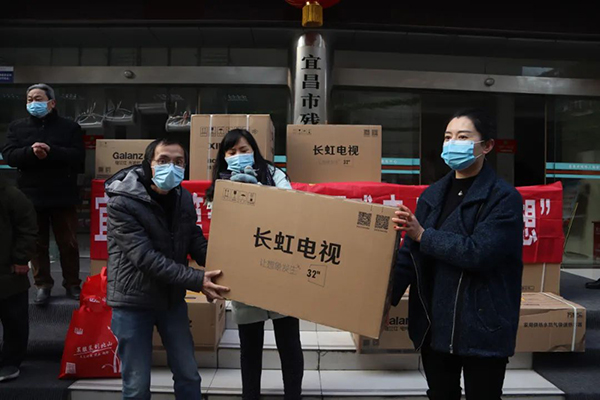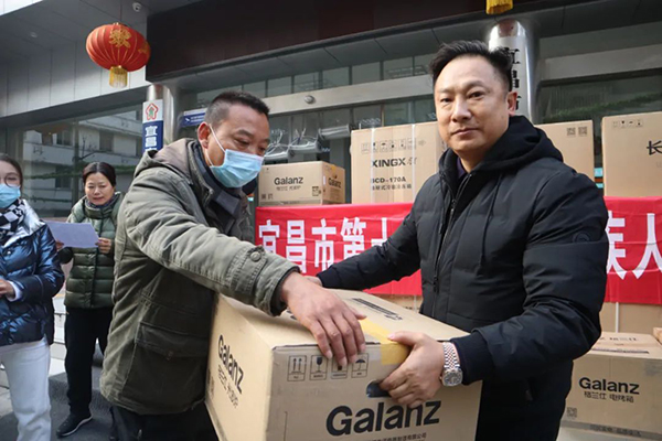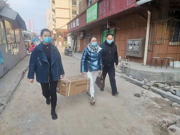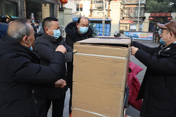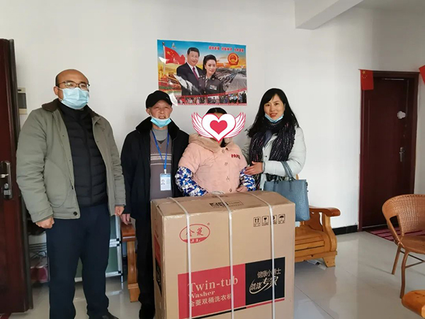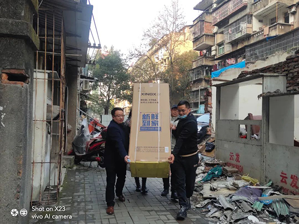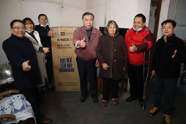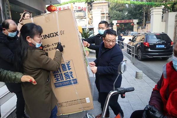 上:民建西陵基层委员会三支部会员郭强,秦周杨、蔡剑英、田琼丽带着冰箱、棉衣去两户“圆梦”。