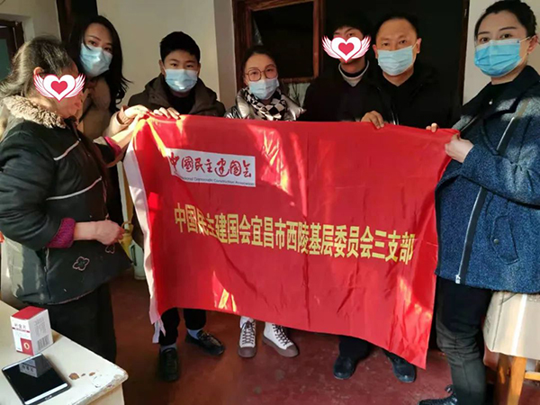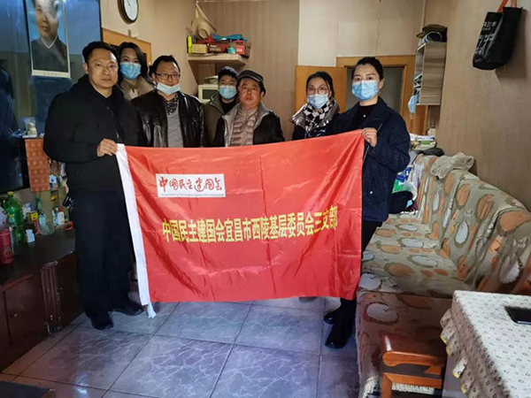 上:民建西陵基层委员会三支部会员 王志华、周思、谢俊,李琴带着爱心物资上门“圆梦”2户。