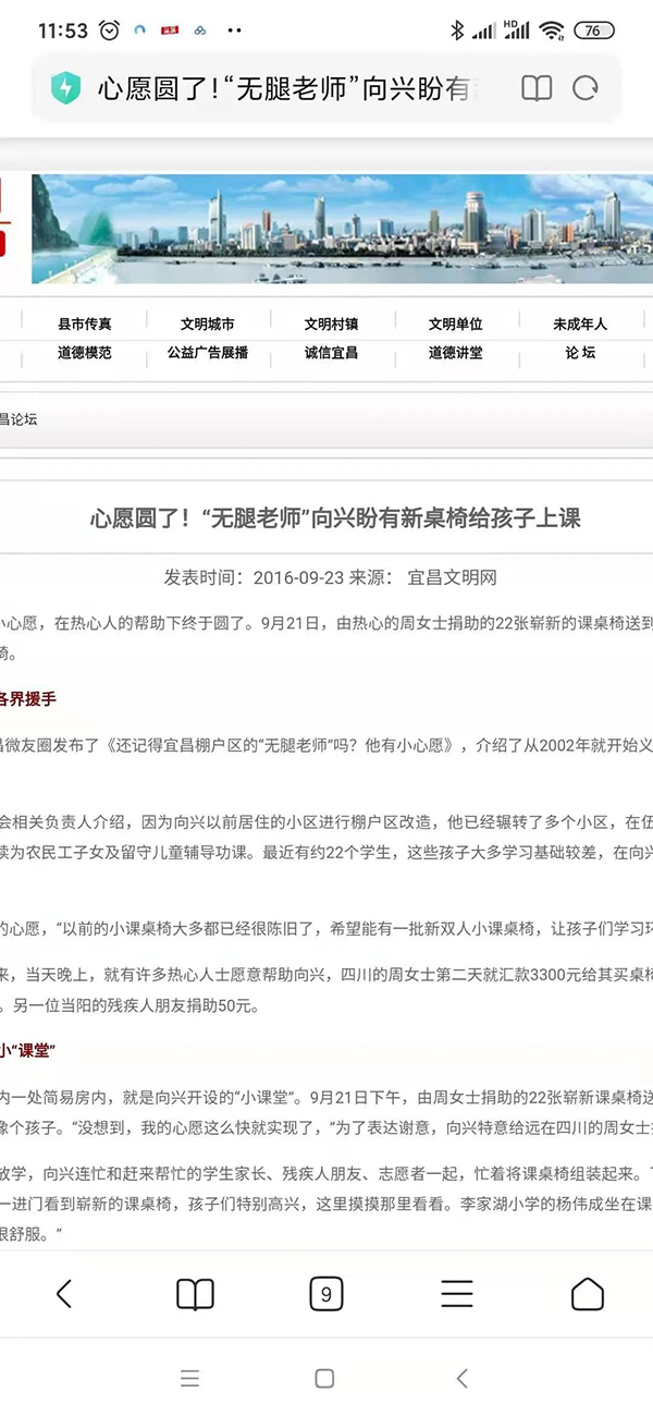 了解相关情况后,我在网上发文《还记得宜昌棚户区的“无腿老师”吗》,被网友广泛热议获得较高的关注度,远在四川的周女士联系了我们,并购买了一批小课桌圆了他的心愿。