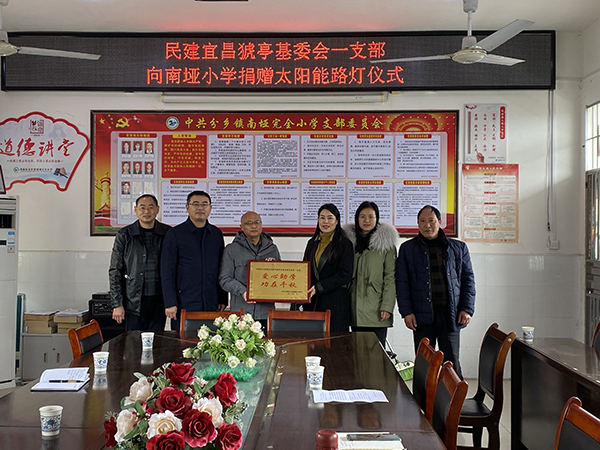 三峡晚报讯(通讯员 刘彦妮)1月7日上午,民建猇亭区基层委员会主委石先勇携爱心企业家一行,到夷陵区分乡镇南垭完全小学,为学校捐赠价值3万余元的智能自控太阳能路灯,为师生带来光明和温暖。